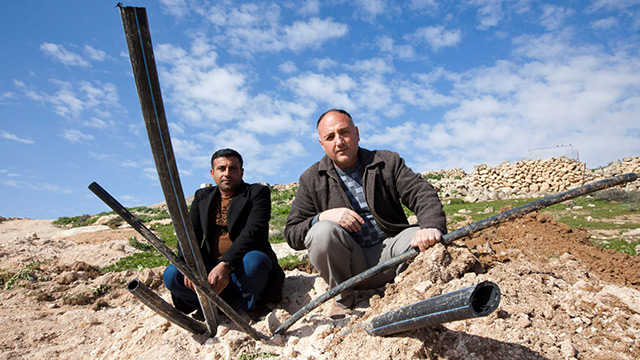 From all of the villages where the Civil Administration destroyed water lines, the Jewish outposts of Mitzpeh Yair and Avigayil can be seen on the hilltops. Although they are unauthorized and illegal even according to lenient Israeli settlement laws, the outposts were connected almost immediately to water and electricity grids and paved roads lead to them.